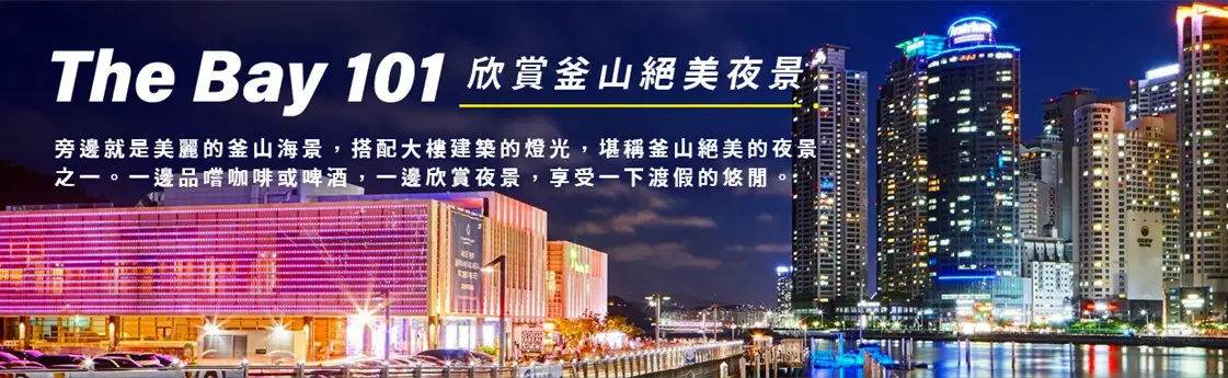 【海雲台The bay 101 海濱夜景】THE BAY 101的夜景不管什麼季節來都別有一番風味,夏天在露天酒吧喝著清涼的啤酒,冬天在咖啡廳享受著溫暖的咖啡,一到晚上所有人的目光都會被形形色色的燈光所吸引。天色一便按就能看到許多人拿著相機拍到忘我。