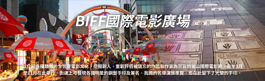 【BIFF國際電影廣場】以介紹各種題材的全世界電影文化,挖掘新人,重新評價被遺忘的作品和作家為宗旨的釜山國際電影節,每年9月至11月在此舉行。街道上可發現各國明星的銅盤手印及簽名,我國的名導演侯孝賢,也在此留下了光榮的手印。