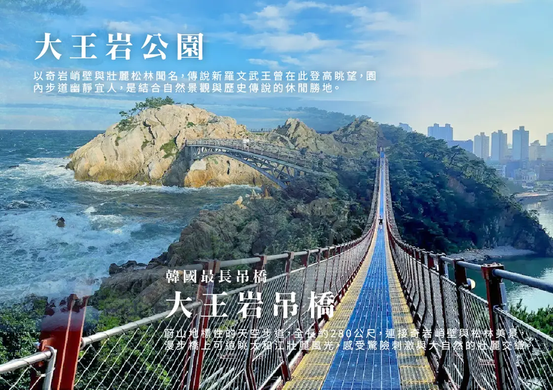 【大王岩公園】在大王岩公園流傳著神祕的護國龍傳說。達成韓半島三國統一偉業的新羅文武大王,曾留下遺言表示希望葬於東海,成為護國神龍守護國家,因此有了慶州文武大王陵。據說在王之後離世的王妃,也希望像丈夫一樣成為守護東海的護國龍,因此葬於蔚山,成為岩石長眠於此。除了大王岩之外,這裡還有許多長相奇特的岩石。放眼望去,可以看到因模樣差點被破壞的男根岩,還有襯帽岩、位於海岸附近的岩島、處女峰等。