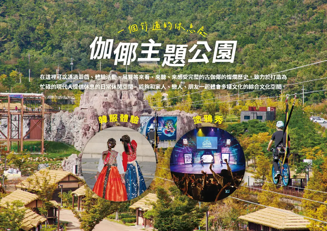 【伽倻主題公園】為了配合金海市豐富的旅游資源、促進金海市經濟發展而開發的觀光主題公園,在這裡可以通過遊戲、體驗活動、展覽等來看、來聽、來感受完整的古伽倻的燦爛歷史。致力於打造為忙碌的現代人提供休息的日常休閒空間,能夠和家人、戀人、朋友一起體會多樣文化的綜合文化空間。